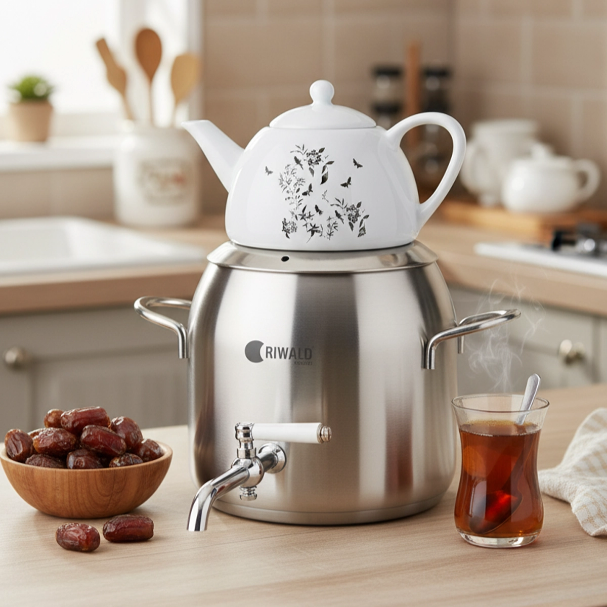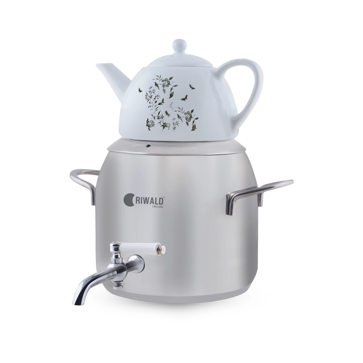 سماور روگازی لیورپول ریوالد 6818155-1020 یک سرویس کتری و قوری از برند مشهور و باکیفیت ریوالد (Riwald) است که با ترکیب جنس استیل و چینی، طراحی مدرن و کاربردی را با دوام بالا تلفیق کرده تا تجربه بهتری از آمادهسازی چای را فراهم آورد. کتری این محصول از استیل ضد زنگ با کیفیت بالا از آلیاژ ۱۸/۱۰ کروم-نیکل ساخته شده که در برابر زنگزدگی و خوردگی بسیار مقاوم است و ظرفیت آن ۳ لیتر میباشد. قوری آن نیز از جنس چینی مرغوب با ظرفیت ۱ لیتر است که طعم و عطر چای را به خوبی حفظ میکند و یکی از ویژگیهای منحصر به فرد آن، مقاومت در برابر حرارت مستقیم است؛ به طوری که میتوان آن را به صورت جداگانه و بدون نگرانی از شکستن، مستقیماً روی شعله گاز قرار داد.