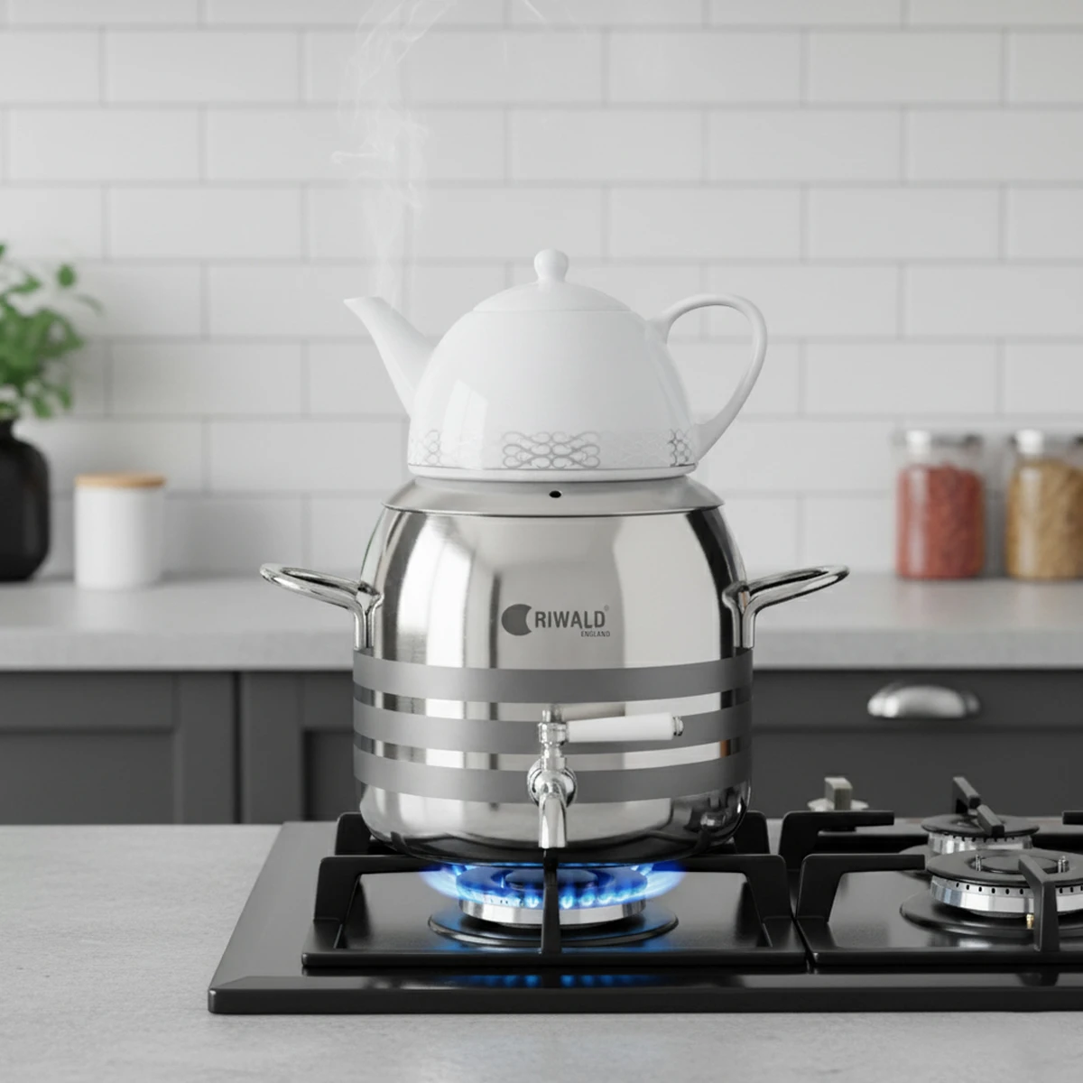 سماور روگازی لیورپول ریوالد 6818166-1022 یک سرویس کتری و قوری از برند مشهور و باکیفیت ریوالد (Riwald) است که با ترکیب جنس استیل و چینی، طراحی مدرن و کاربردی را با دوام بالا تلفیق کرده تا تجربه بهتری از آمادهسازی چای را فراهم آورد. کتری این محصول از استیل ضد زنگ با کیفیت بالا از آلیاژ ۱۸/۱۰ کروم-نیکل ساخته شده که در برابر زنگزدگی و خوردگی بسیار مقاوم است و ظرفیت آن ۳ لیتر میباشد. قوری آن نیز از جنس چینی مرغوب با ظرفیت ۱ لیتر است که طعم و عطر چای را به خوبی حفظ میکند و یکی از ویژگیهای منحصر به فرد آن، مقاومت در برابر حرارت مستقیم است؛ به طوری که میتوان آن را به صورت جداگانه و بدون نگرانی از شکستن، مستقیماً روی شعله گاز قرار داد.